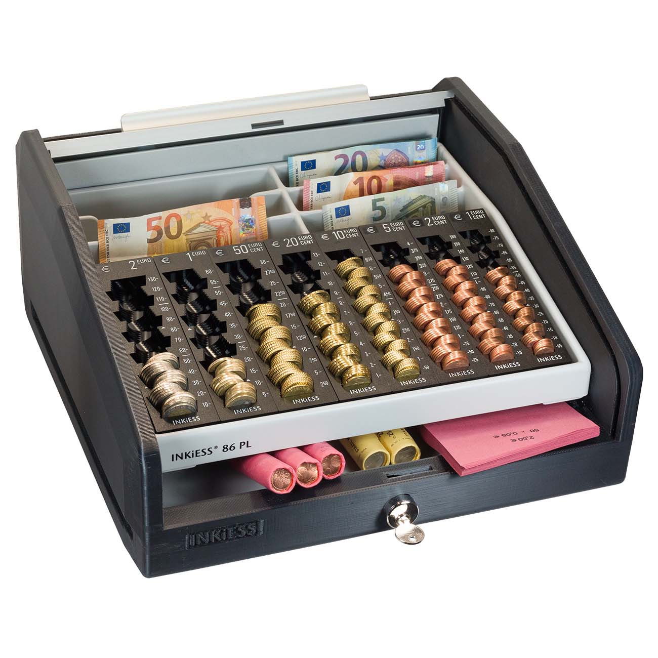 With storage area for bundels and rolls of money, sales slips etc. under the cash insert.