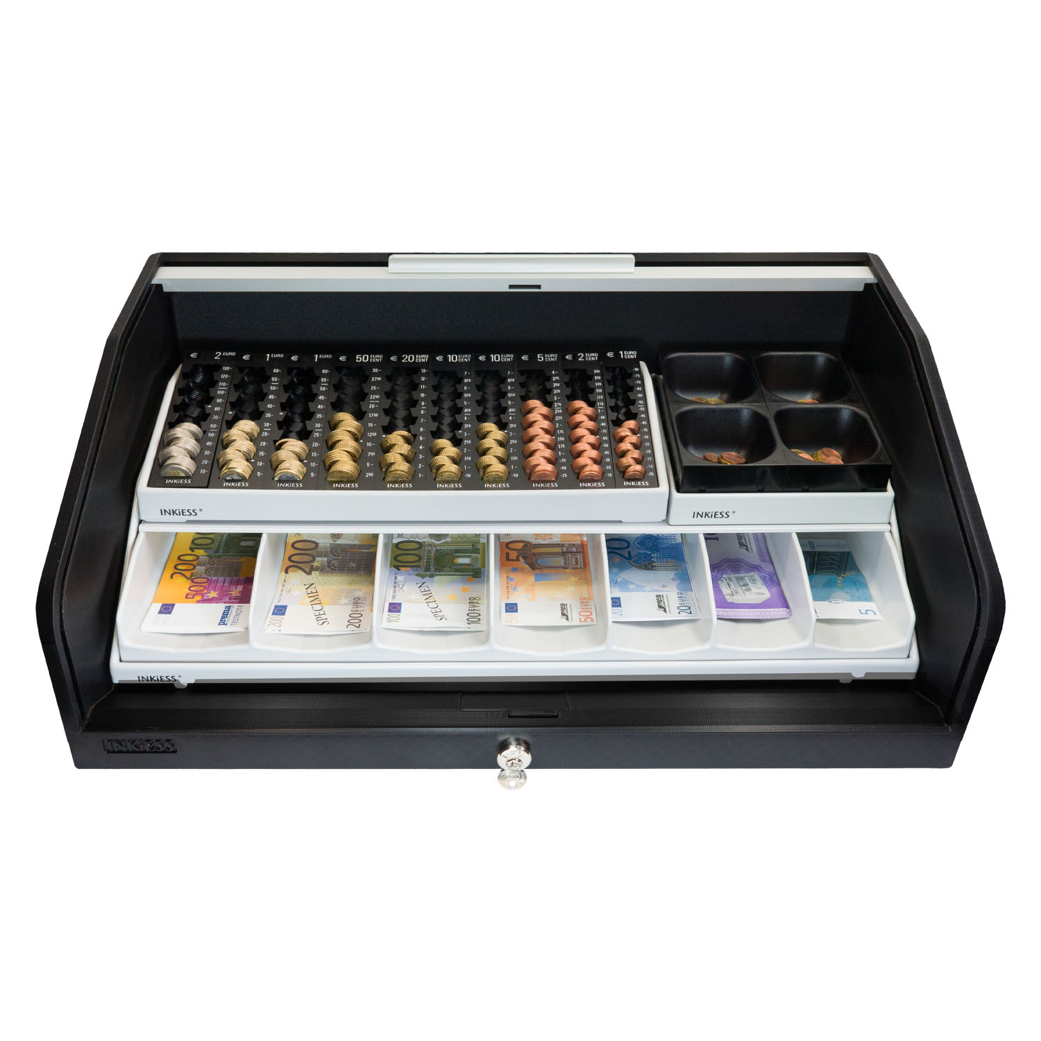 With storage area for bundels and rolls of money, sales slips etc. under the cash insert.