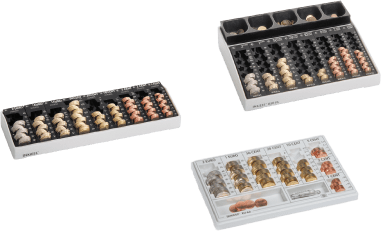 Banknote compartments, money containers, coin roll boxes, universal money containers